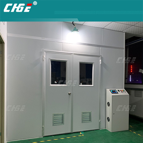 老化房一般根據客戶場地與實際需求,現場安裝,像這種風管在上面外露就是和客戶溝通過得到客戶應允的,另一種做法是將立板加長加高,將風管藏于里面,所以各種做法都可以實現,只是造價成本會有所不同,因此,在美觀上會不如隱藏式風管的模式,實際效果上,隱藏式也可以將風機的噪音擋住一部分,我們一般會提前告知各種方式與推介。