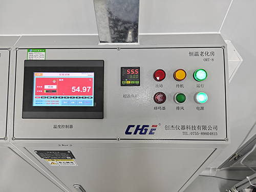 如上圖面板所示,溫度控制器為可觸摸,可編程,可循環時間設置等;而右側的小表也是一樣數顯的控制器我們用來做為溫度超溫時的二重保護,觸摸屏的大表里面有第一重超溫保護,而創杰的老化房共用了三重超溫保護以確保設備不會因為超溫失控而造成損失;USB接口可作為設備運行數據的導出。